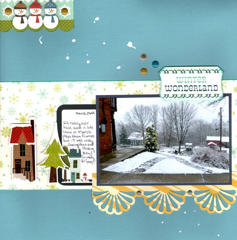 Beautiful, "winter wonderland"! Adorable embellishments. Love the splatters and dots too.